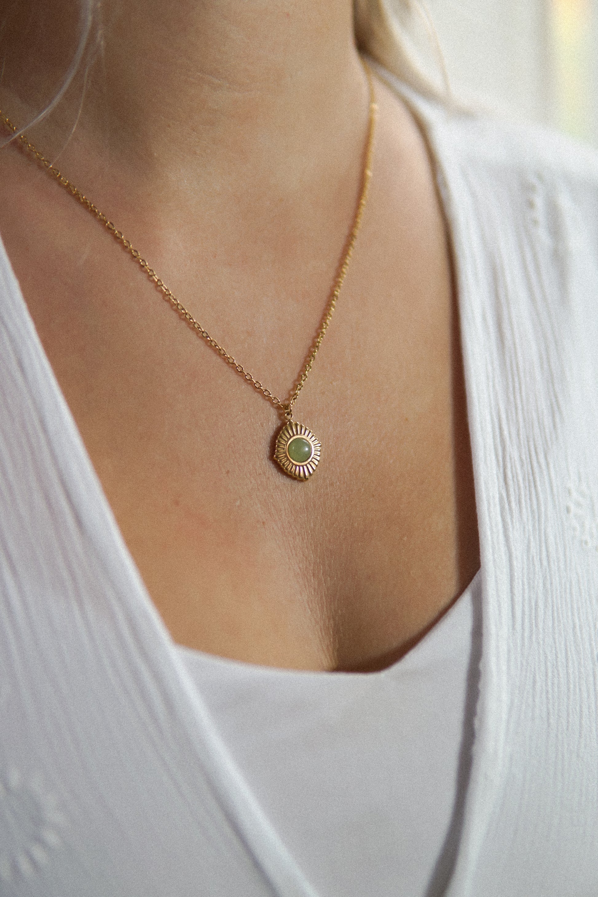 Diese goldene Halskette aus Edelstahl trägt einen Anhänger mit grünem Aventurin, eingefasst in ein orientalisch inspiriertes Design. Der Aventurin steht für Zuversicht und innere Ruhe.