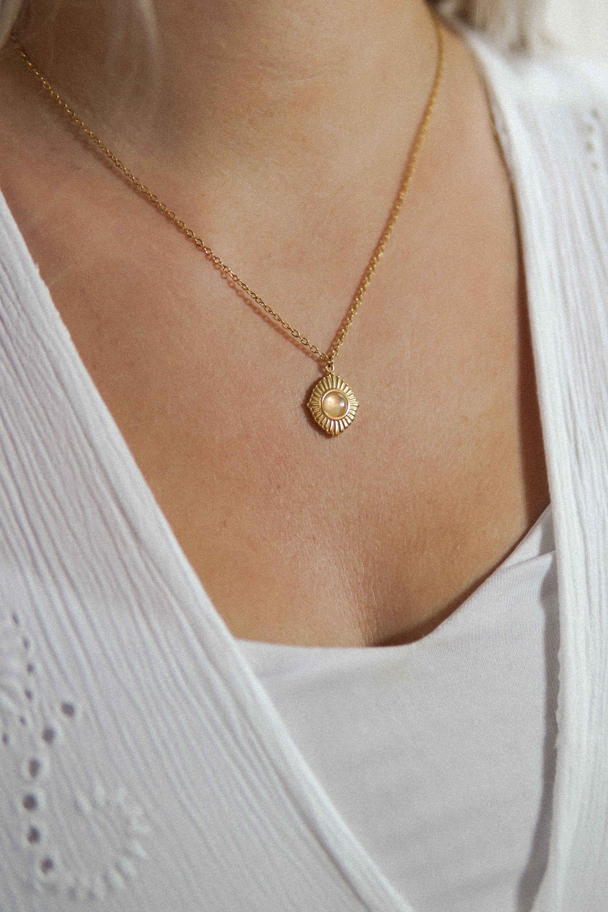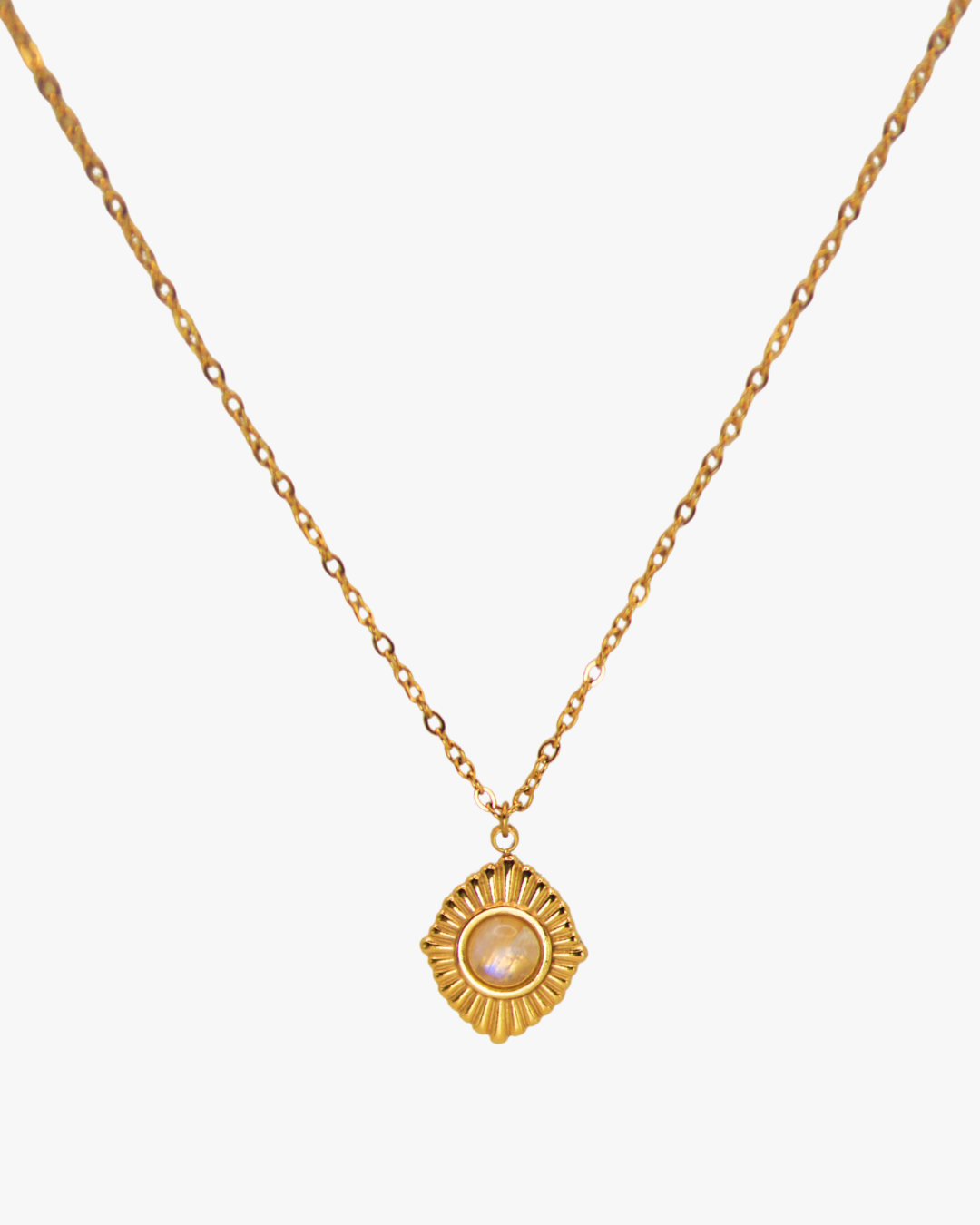 Diese goldene Halskette aus Edelstahl trägt einen schimmernden Mondstein in einem orientalisch inspirierten Anhänger. Der Mondstein symbolisiert Intuition, Weiblichkeit und innere Balance.