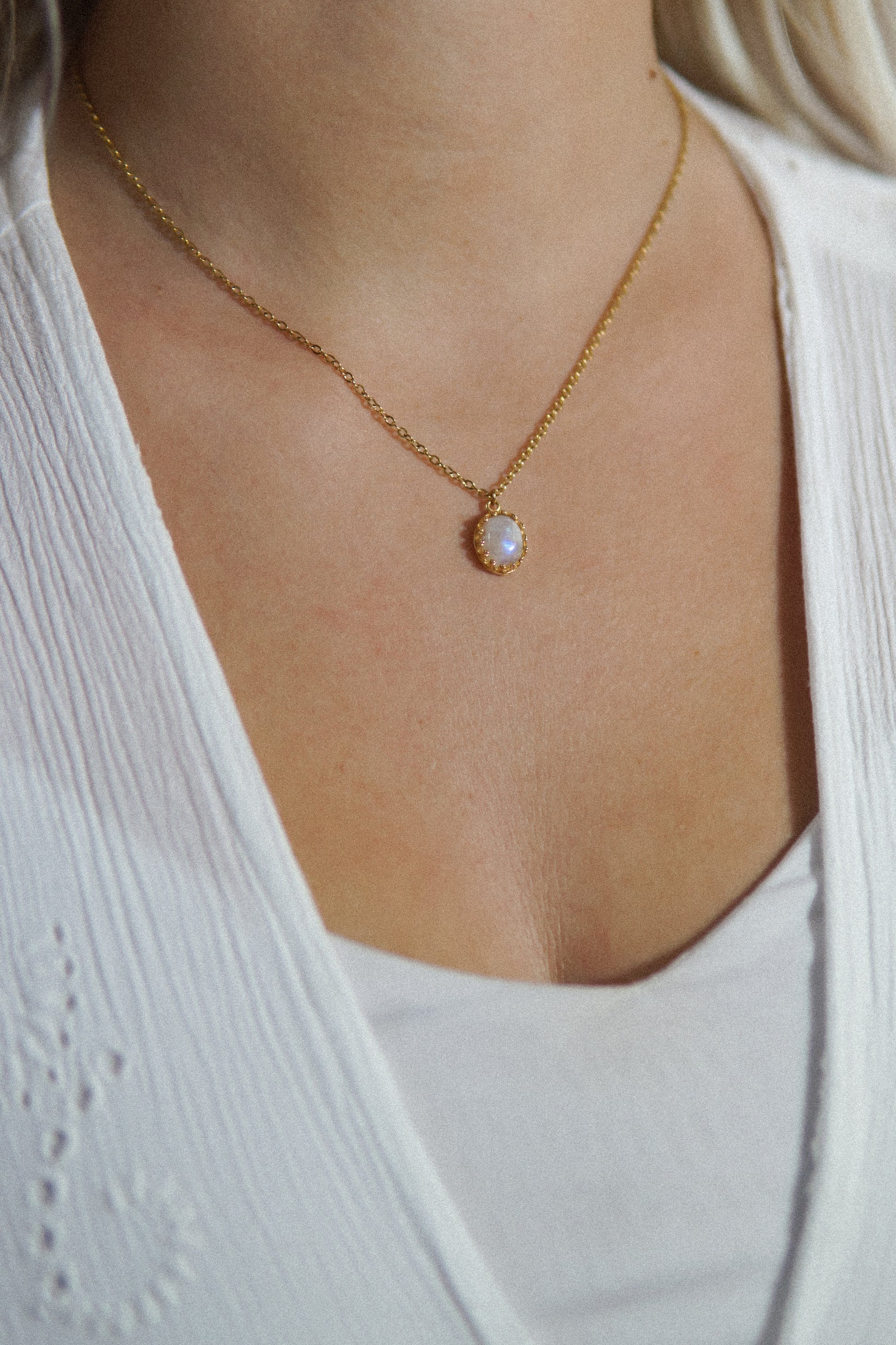 Diese goldene Halskette aus Edelstahl trägt einen fein schimmernden Mondstein, eingefasst in eine zarte Kronenfassung. Der Edelstein steht für Intuition, Weiblichkeit und innere Ruhe. Moonstone Royale vereint sanftes Mondlicht mit goldener Eleganz.