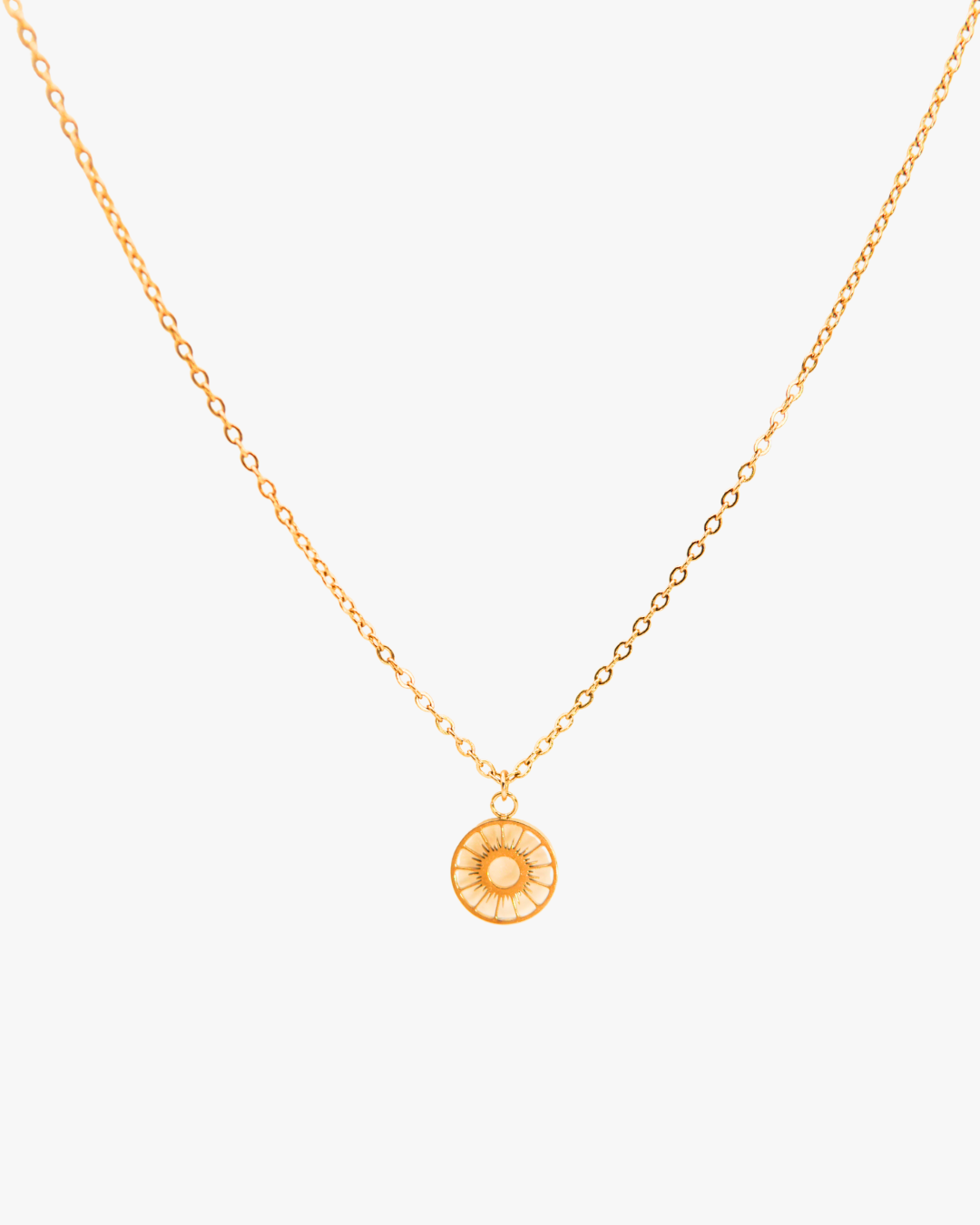 Diese goldene Halskette aus Edelstahl trägt einen fein gearbeiteten Sonnenanhänger, der für Wärme, Energie und Lebensfreude steht. Soleil vereint minimalistisches Design mit symbolischer Tiefe.