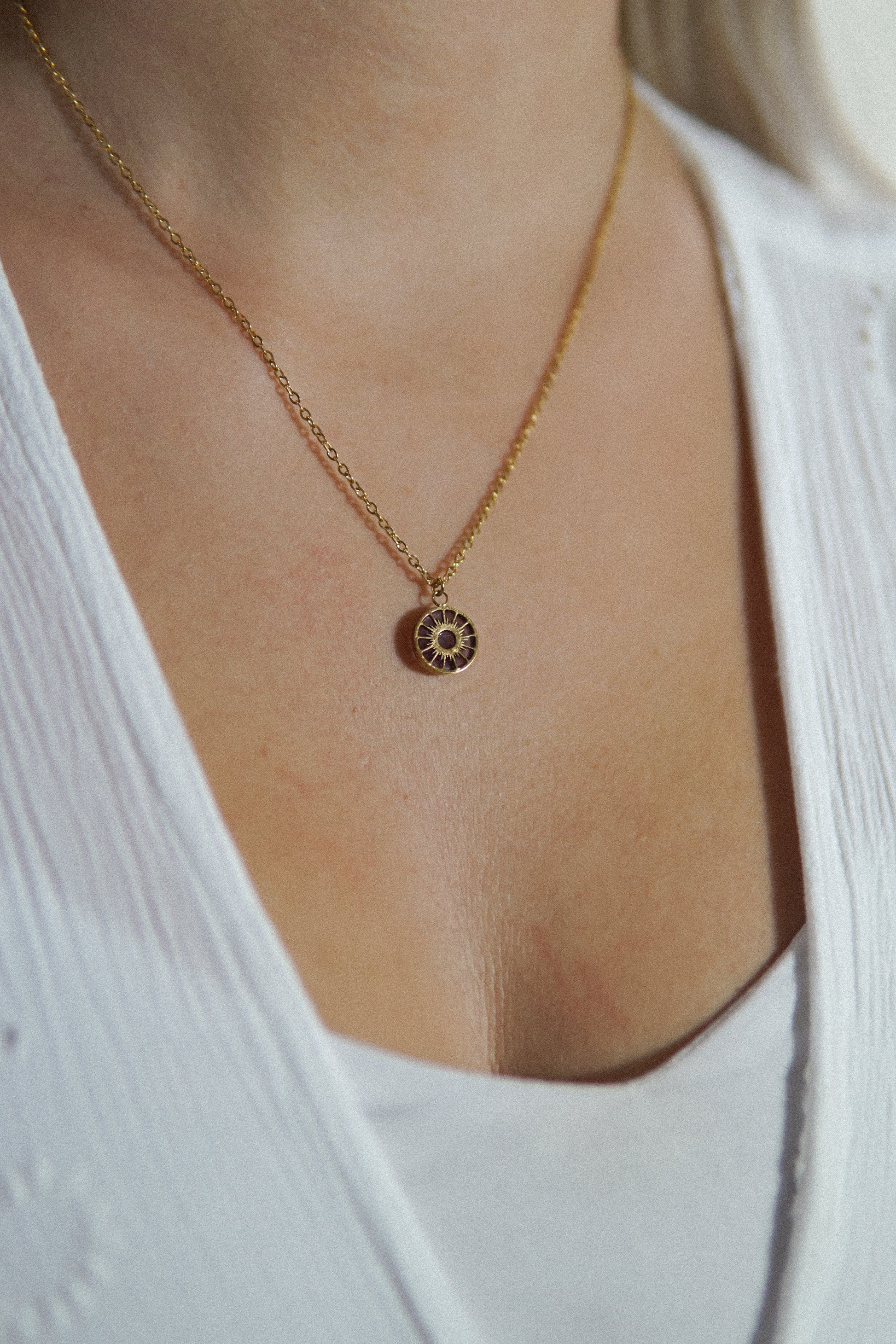 Diese goldene Halskette aus Edelstahl trägt einen filigranen Sonnenanhänger mit einem zart violetten Amethyst. Der Edelstein steht für Klarheit, Intuition und innere Ruhe. Soleil Amethyst vereint goldenes Strahlen mit spiritueller Tiefe.