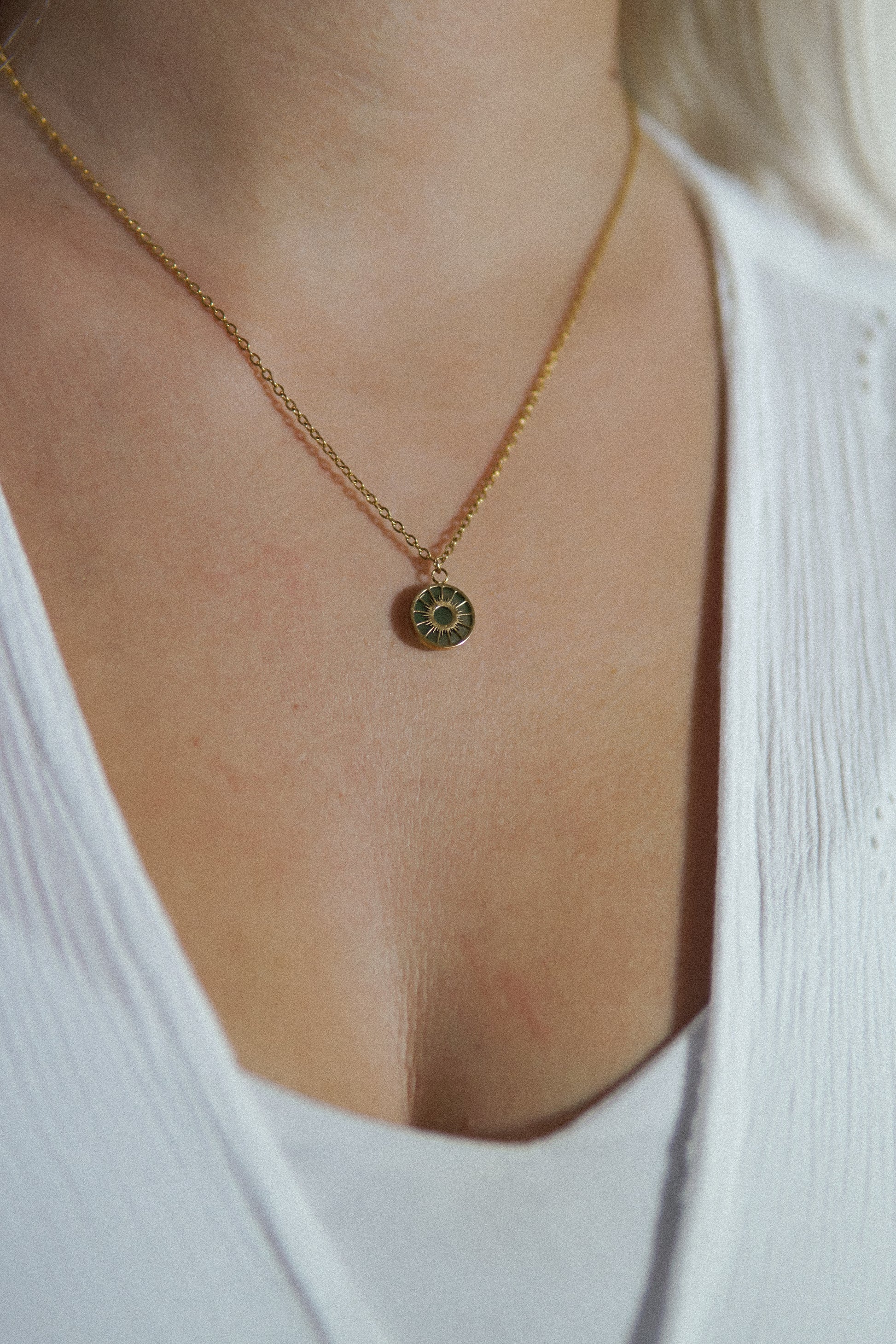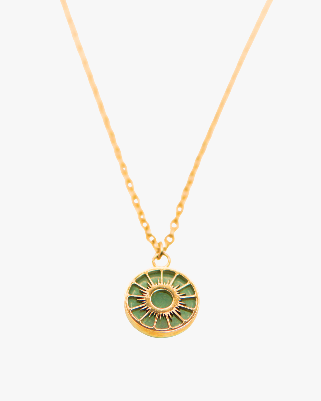 Diese goldene Halskette aus Edelstahl trägt einen fein gearbeiteten Sonnenanhänger mit grünem Aventurin. Der Edelstein steht für Zuversicht, Wohlbefinden und innere Balance. Sol Essence Aventurin vereint goldene Wärme mit natürlicher Harmonie.