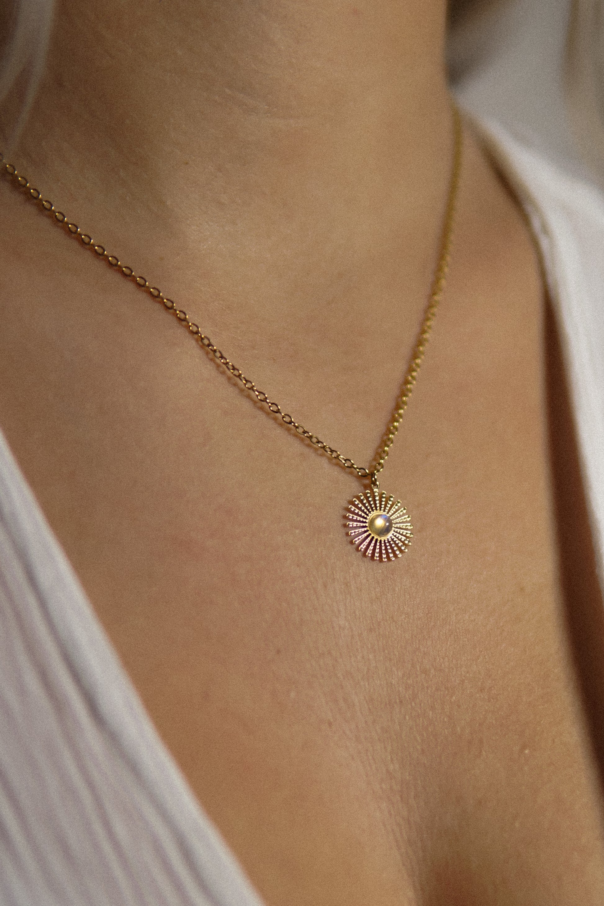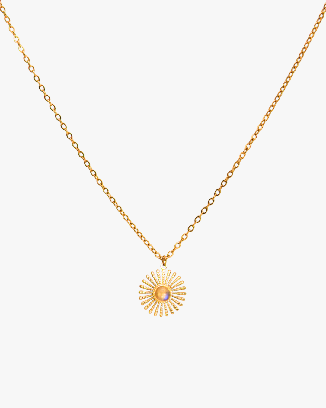 Diese goldene Halskette aus Edelstahl trägt einen fein schimmernden Mondstein im Zentrum eines sonnenförmigen Anhängers. Soleil de lune vereint die Wärme der Sonne mit der Ruhe des Mondes. Ein Symbol für Balance, Licht und innere Stärke.