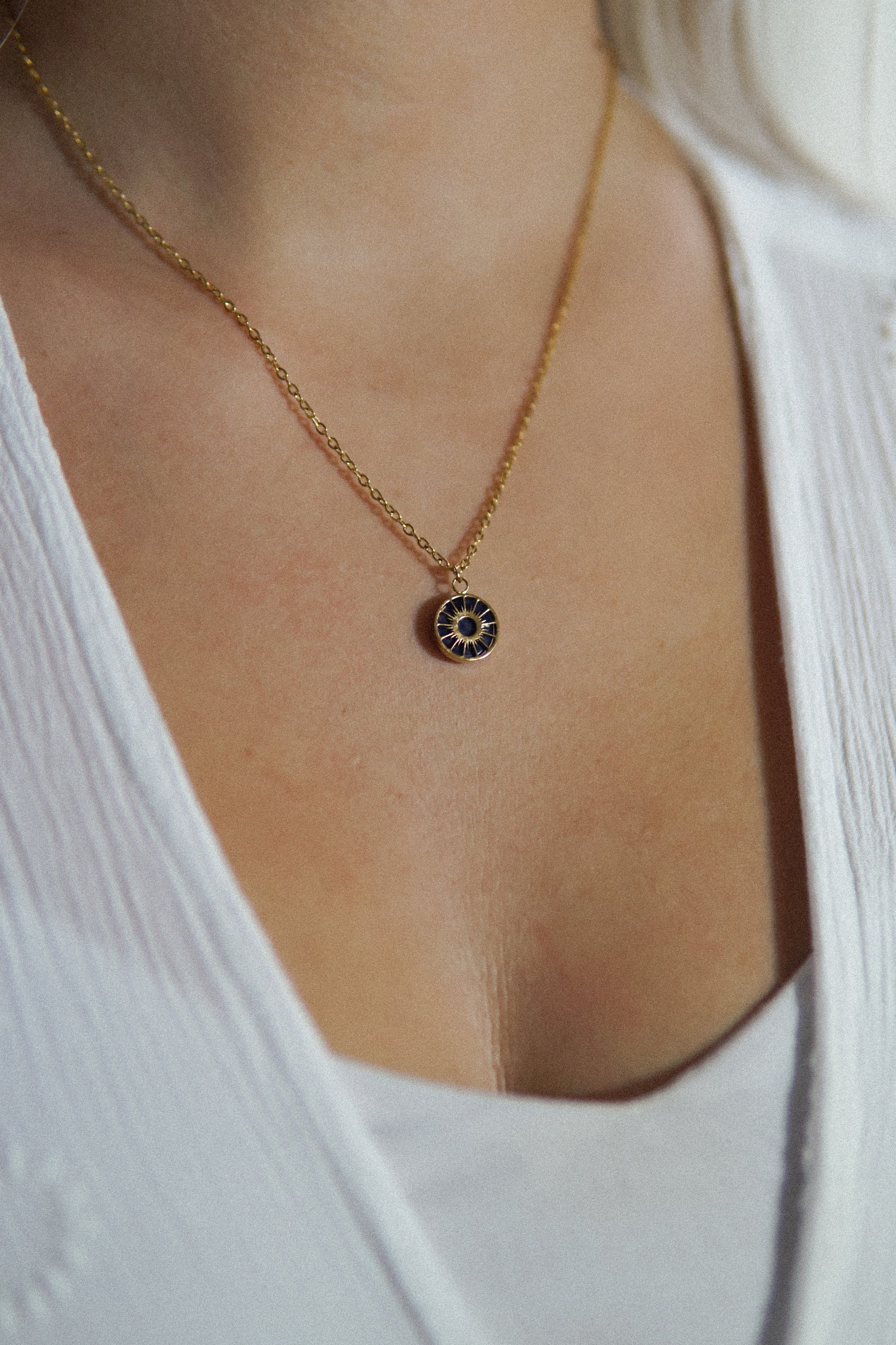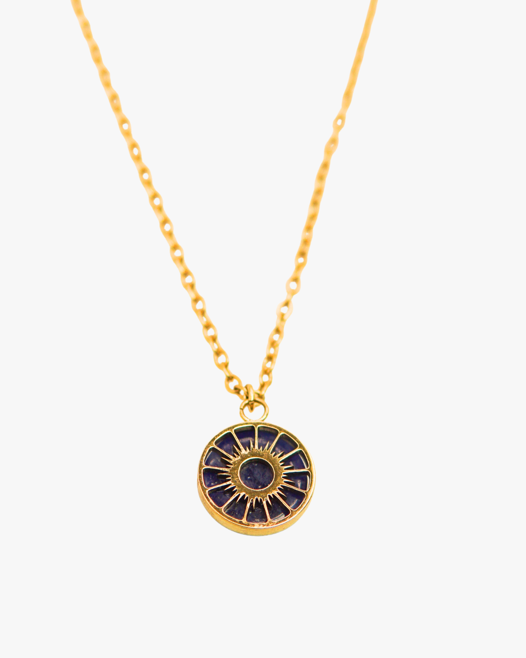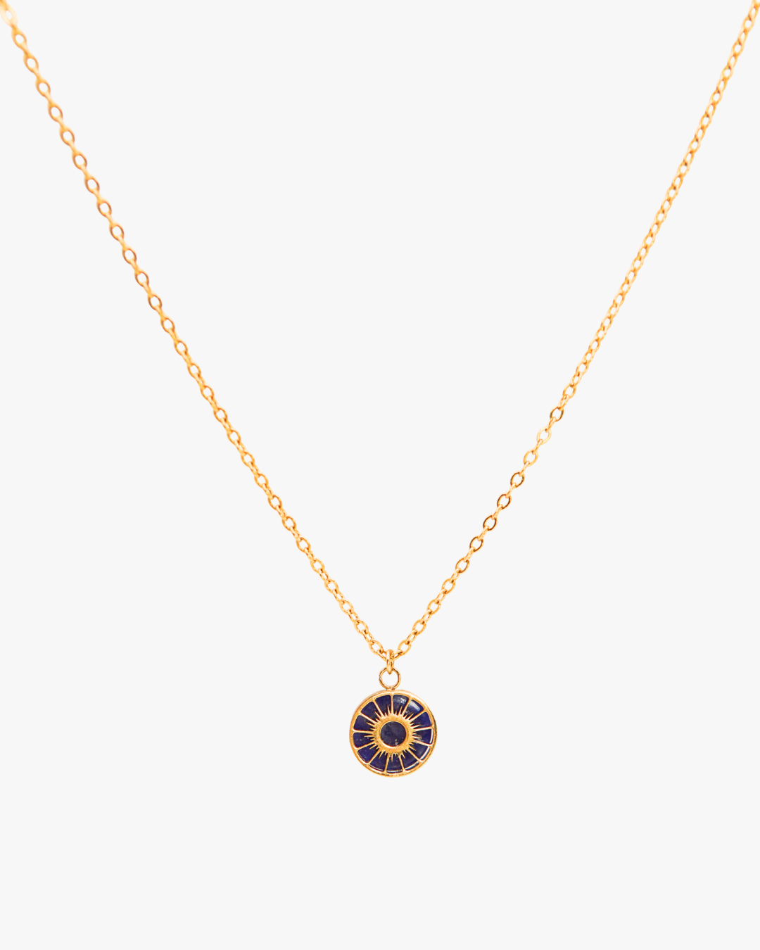 Diese goldene Halskette aus Edelstahl trägt einen filigranen Sonnenanhänger mit tiefblauem Sodalith. Der Edelstein symbolisiert Wahrheit, Selbstvertrauen und innere Ruhe. Soleil Sodalith vereint die goldene Wärme der Sonne mit der Tiefe des Himmel.